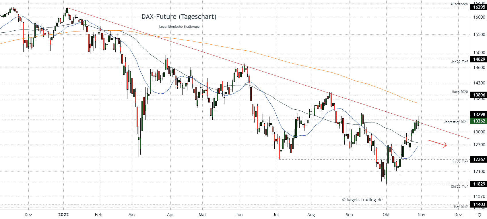 DAX-Chartanalyse von Christian Möhrer: Der abgebildete Tageschart des DAX-Future zeigt den Kursverlauf seit Ende 2021. Jede Kurskerze spiegelt die Entwicklung am betreffenden Tag wider.