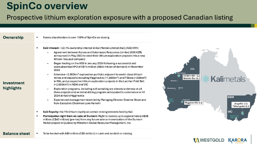 In den ‚Spin-out‘ sollen die Aktienanteile von Kali Metals (ASX: KM1) eigebracht werden, inklusive 5 Mio. CAD Cash und noch dem Zahlungsanspruch, bei einem eventuellen Verkauf des ‚Dumont‘-Projektes. Diese noch junge Gesellschaft wird zu 100 % in den Händen der Karora Resources (WKN: A2QAN6)-Aktionäre gehalten, da hier Westgold und seine Aktionäre außen vor bleiben.