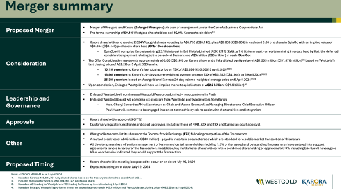 Dieses unterbreitete Angebot stellt eine Prämie von 10 % gegenüber dem Karora-Schlusskurs vom vergangenen Freitag und eine Prämie in Höhe von einem Viertel basierend auf den 20-tägigen volumengewichteten Durchschnittskursen von Karora und Westgold dar. Vorbehaltlich der Zustimmung der Karora-Aktionäre, den Aufsichtsbehörden und anderen nötigen Genehmigungen wird die Fusion voraussichtlich gegen Ende Juli abgeschlossen werden. Diese Fusion bietet nicht nur Vorteile für beide Unternehmen, sondern schafft auch einen mittelgroßen Goldproduzenten mit klarem Fokus auf Effizienz und Wachstum.